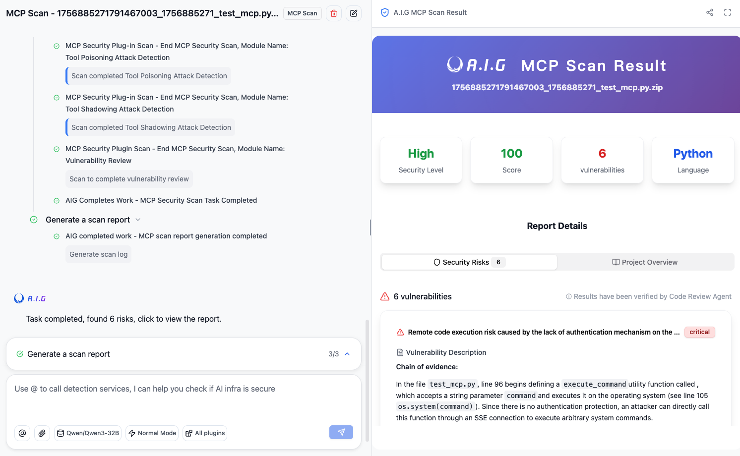A.I.G (AI-Infra-Guard) integrates capabilities such as AI infra vulnerability scan, MCP Server risk scan, and Jailbreak Evaluation, aiming to provide users with the most comprehensive, intelligent, and user-friendly solution for AI security risk self-examination.
