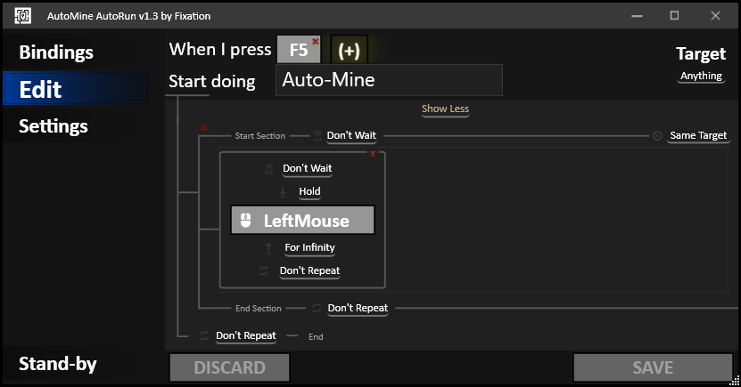 Supports recording, editing and creating any keybindings to initiate automatic keyboard and mouse input. The tool will start preloaded with 2 keybindings that allow Auto-Run and Auto-Mine.