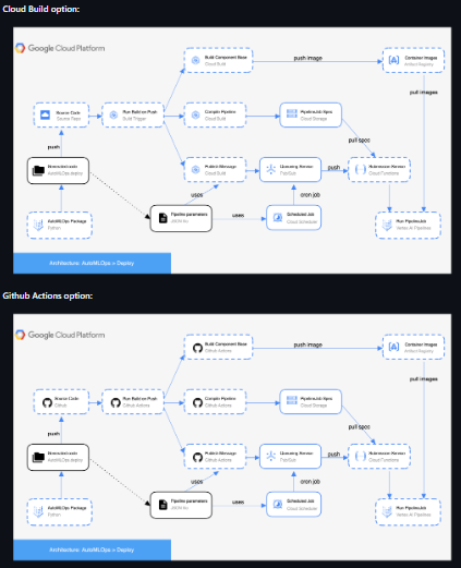 AutoMLOps is a service that generates, provisions, and deploys CI/CD integrated MLOps pipelines, bridging the gap between Data Science and DevOps. AutoMLOps provides a repeatable process that dramatically reduces the time required to build MLOps pipelines. The service generates a containerized MLOps codebase, provides infrastructure-as-code to provision and maintain the underlying MLOps infra, and provides deployment functionalities to trigger and run MLOps pipelines. AutoMLOps gives flexibility over the tools and technologies used in the MLOps pipelines, allowing users to choose from a wide range of options for artifact repositories, build tools, provisioning tools, orchestration frameworks, and source code repositories. AutoMLOps can be configured to either use existing infra, or provision new infra, including source code repositories for versioning the generated MLOps codebase, build configs and triggers, artifact repositories for storing docker containers, storage buckets, etc.