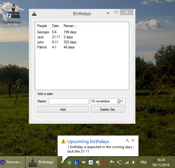 [EN] Tired of forgetting important dates? This light software will come in handy! Launching itself at startup, it will notify you of the upcoming birthdays, thanks to a tray bubble and a color system.