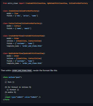 - Lets you edit a formset related to a model (using Django's inlineformset_factory).