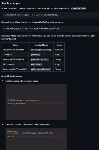 Android library to get device information in a super easy way. The library is built for simplicity and approachability. It not only eliminates most boilerplate code for dealing with device information but also provides an easy and simple API to retrieve them. EasyDeviceInfo is split into multiple module-libraries, v2.2.0 onwards. Use the appropriate one as per your requirement.