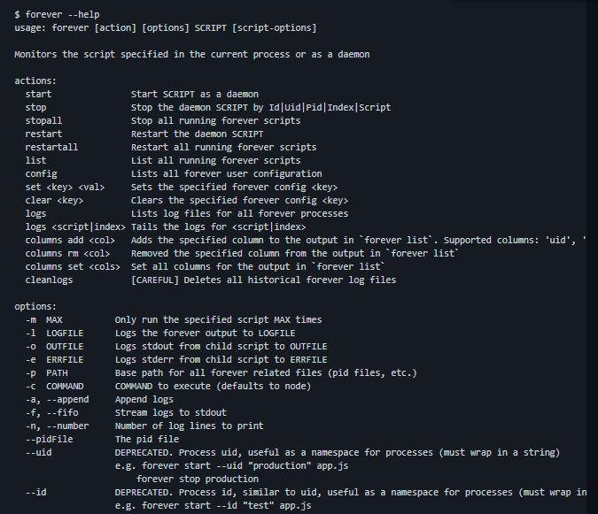 A simple CLI tool for ensuring that a given script runs continuously (i.e. forever). Note that this project currently fully depends on the community for implementing fixes and new features. For new installations we encourage you to use pm2 or nodemon. If you are using forever programmatically you should install forever-monitor. There are two ways to use forever: through the command line or by using forever in your code. Note: If you are using forever programatically you should install forever-monitor. You can use forever to run scripts continuously (whether it is written in node.js or not). In addition to passing forever the path to a script (along with accompanying options, described above), you may also pass forever the path to a JSON file containing these options. The forever module exposes some useful methods to use in your code. Each method returns an instance of an EventEmitter which emits when complete.