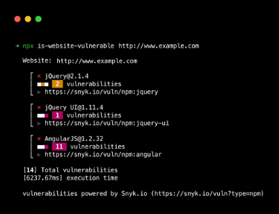 A command-line tool that scans websites for known security vulnerabilities in their frontend dependencies by checking against the Snyk vulnerability database.