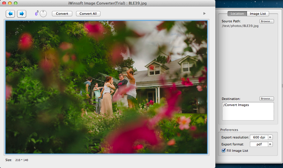 iWinSoft Image Converter application to view the image files on Mac, and convert them to most popular image formats including PDF, PNG, JPEG, GIF, TIFF, EPS, PICT, BMP and SGI. You can navigate throught the images in a folder using navigation keys and keyboard shortcuts. Changing the view size allows to view at different zoom amounts. Also you have ability to rotate selected Image file. To choose Image file just drag it into main window. To convert a file you need to click the Convert button. Choose one of the export formats, and the export resolution in the Preferences Drawer. You may also set the destination folder and filename. Selecting Same Destination location will create the converted file at the same location as the original one.