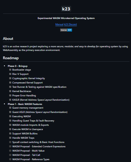 k23 is a microkernel-based operating system project written in Zig, an emerging systems programming language focused on safety, simplicity, and performance. k23 explores the design of modern OS features like message-passing, memory protection, and modular service construction using Zig’s powerful low-level capabilities. It is an experimental and educational project intended to show how Zig can be used for robust, readable systems programming while enabling contributors to rethink traditional OS structures from the ground up.