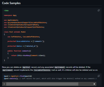 In scenarios when you delete a parent record - say for example a blog post - you may want to also delete any comments associated with it as a form of self-maintenance of your data. Normally, you would use your database's foreign key constraints, adding an ON DELETE CASCADE rule to the foreign key constraint in your comments table. It may be useful to be able to restore a parent record after it was deleted. In those instances, you may reach for Laravel's soft deleting functionality. In doing so, however, you lose the ability to use the cascading delete functionality that your database would otherwise provide. That is where this package aims to bridge the gap in functionality when using the SoftDeletes trait.