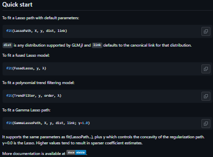 - Lasso.jl includes an implementation of the O(n) fused Lasso implementation