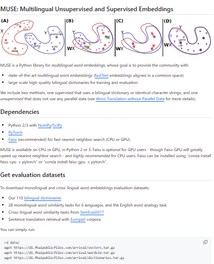 MUSE is a framework for learning multilingual word embeddings that live in a shared space, enabling bilingual lexicon induction, cross-lingual retrieval, and zero-shot transfer. It supports both supervised alignment with seed dictionaries and unsupervised alignment that starts without parallel data by using adversarial initialization followed by Procrustes refinement. The code can align pre-trained monolingual embeddings (such as fastText) across dozens of languages and provides standardized evaluation scripts and dictionaries. By mapping languages into a common vector space, MUSE makes it straightforward to build cross-lingual applications where resources are scarce for some languages. The training and evaluation pipeline is lightweight and fast, so experimenting with different languages or initialization strategies is easy. Beyond dictionary induction, the learned embeddings are often used as building blocks for downstream tasks like classification, retrieval, or machine translation.