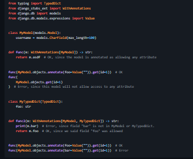 This package contains type stubs and a custom mypy plugin to provide more precise static types and type inference for Django framework. Django uses some Python "magic" that makes having precise types for some code patterns problematic. This is why we need this project. The final goal is to be able to get precise types for the most common patterns. We are independent from Django at the moment. There's a proposal to merge our project into the Django itself. You can show your support by liking the PR. This project does not affect your runtime at all. It only affects mypy type checking process. The current implementation uses Django's runtime to extract information about models, so it might crash if your installed apps or models.py are broken.