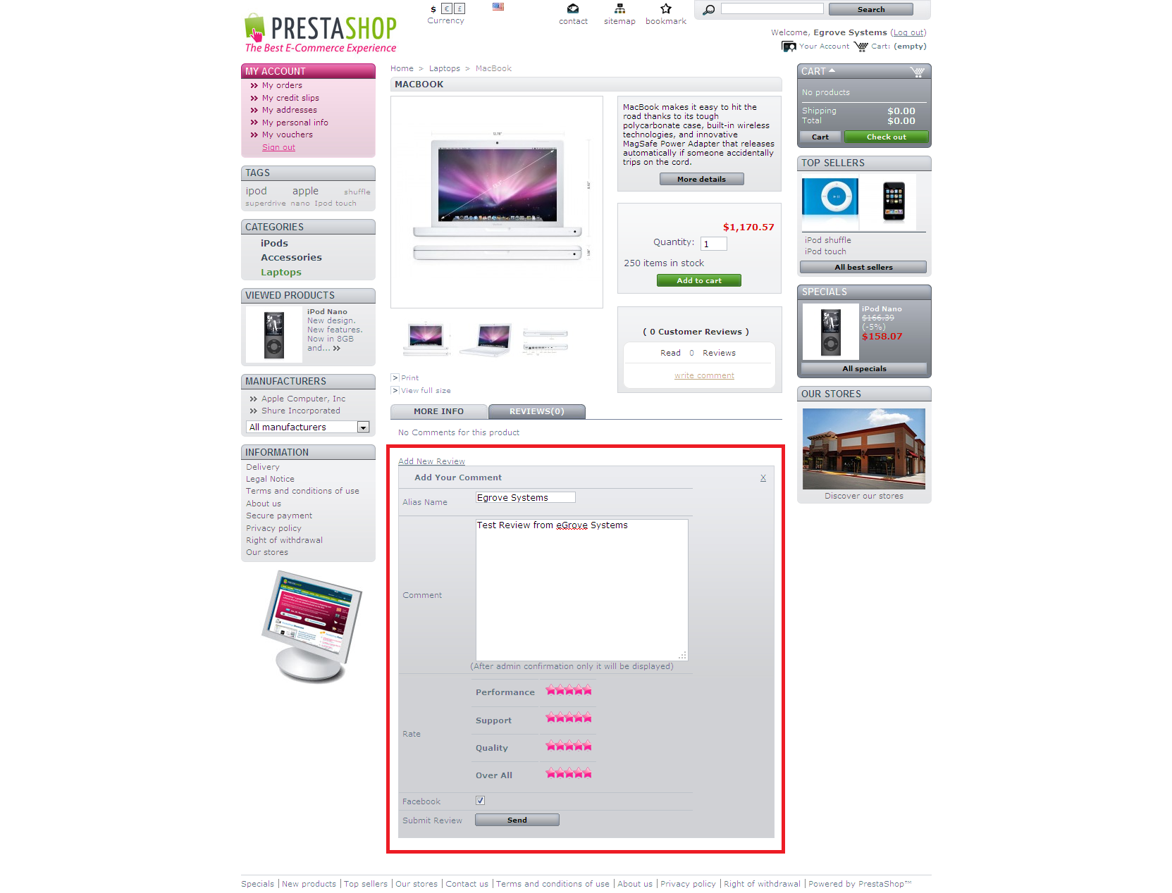- Facebook Social integration facility through Facebook Post of Product Review along product image, product URL and user comment to buyer’s Facebook account