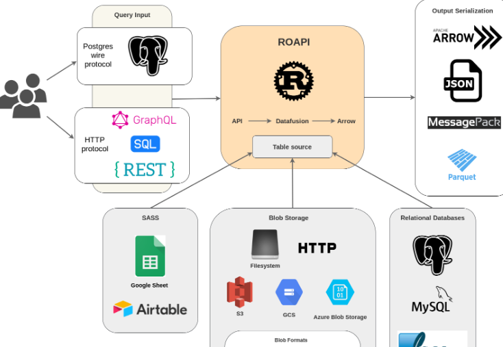Create full-fledged APIs for slowly moving datasets without writing a single line of code. ROAPI automatically spins up read-only APIs and query frontends for slowly moving datasets without requiring you to write a single line of code. It builds on top of Apache Arrow and Datafusion. Query frontends to translate SQL, GraphQL and REST API queries into Datafusion plans. Datafusion for query plan execution. Data layer to load datasets from a variety of sources and formats with automatic schema inference. Response encoding layer to serialize intermediate Arrow record batch into various formats requested by the client. Its pluggable query core design makes it possible for users to efficiently perform join queries across a diverse set of data sources from simple CSV/Parquet files in Data warehouses to MySQL/Postgres, to SASS-like Google spreadsheets.