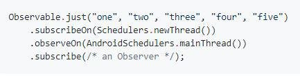 RxAndroid: Reactive Extensions for Android. Android specific bindings for RxJava 3. This module adds the minimum classes to RxJava that make writing reactive components in Android applications easy and hassle-free. More specifically, it provides a Scheduler that schedules on the main thread or any given Looper. Additional binaries and dependency information for can be found at search.maven.org. One of the most common operations when dealing with asynchronous tasks on Android is to observe the task's result or outcome on the main thread. Using vanilla Android, this would typically be accomplished with an AsyncTask. With RxJava instead you would declare your Observable to be observed on the main thread.