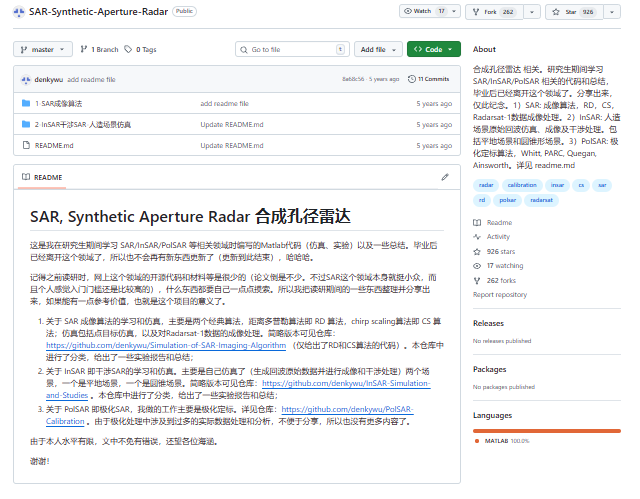 This repository is a collection of MATLAB codes, simulations, and summaries related to Synthetic Aperture Radar (SAR), InSAR, and PolSAR. The author compiled implementations of classic SAR imaging algorithms (e.g. Range-Doppler (RD) algorithm, Chirp Scaling (CS) algorithm), synthetic scenes, InSAR (interferometric) simulation including multiple terrain types (flat, conical), and polarization calibration techniques (Whitt, PARC, Quegan, Ainsworth). The readme states that these were research/learning codes, with experiments and reports, and no further maintenance is expected. InSAR (interferometric SAR) simulation and processing. PolSAR (polarimetric SAR) calibration algorithms.