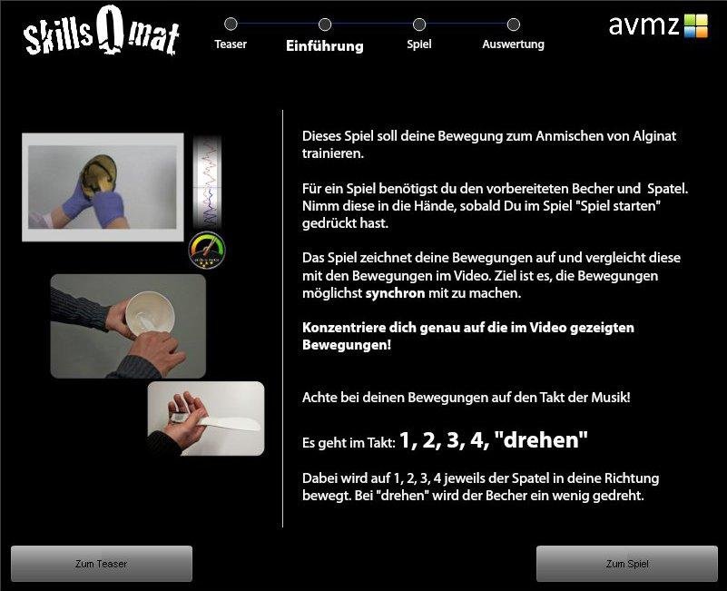Skills-O-Mat is a simple reuseable serious game to train periodic rhythmic motions. Although Skills-O-Mat was developed for a special training of alginate mixing, it is also capable of training similar motions like cardiac massage. Players use the prepared input devices (spoon and bowl in case of alginate mixing) to start immediate training. No further preparation of the player is required. The game collects motion data in real-time and evaluates the differences between the player and the virtual teacher.