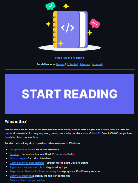 Tech Interview Handbook is a curated, mostly self-contained compilation of technical interview preparation resources—including algorithms, system design, resume tips, and behavioral questions—crafted for busy software engineers. The information in this repository is condensed. Ultimately, the key to succeeding in technical interviews is consistent practice and I don't want to bore you with too many words. I tell you the minimum you need to know on how to go about navigating the interview process, you go and practice and land your dream job. This repository has practical content that covers all phases of a technical interview, from applying for a job to passing the interviews to offer negotiation. Technically competent candidates might still find the non-technical content helpful. Also, existing resources focus mainly on algorithm questions and lack coverage for more domain-specific and non-technical questions.