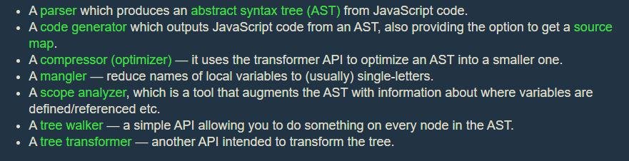 UglifyJS is a JavaScript compressor/minifier written in JavaScript. It also contains tools that allow one to automate working with JavaScript code. A parser which produces an abstract syntax tree (AST) from JavaScript code. A code generator which outputs JavaScript code from an AST, also providing the option to get a source map. A compressor (optimizer). it uses the transformer API to optimize an AST into a smaller one. A mangler, reduce names of local variables to (usually) single-letters. A scope analyzer, which is a tool that augments the AST with information about where variables are defined/referenced etc. A tree walker, a simple API allowing you to do something on every node in the AST. A tree transformer, another API intended to transform the tree. All the above utilities and APIs are defined in ~6500 lines of code (except for the effective generation of the source-map, which is handled by the source-map module). Compared to alternatives, UglifyJS is pretty small.