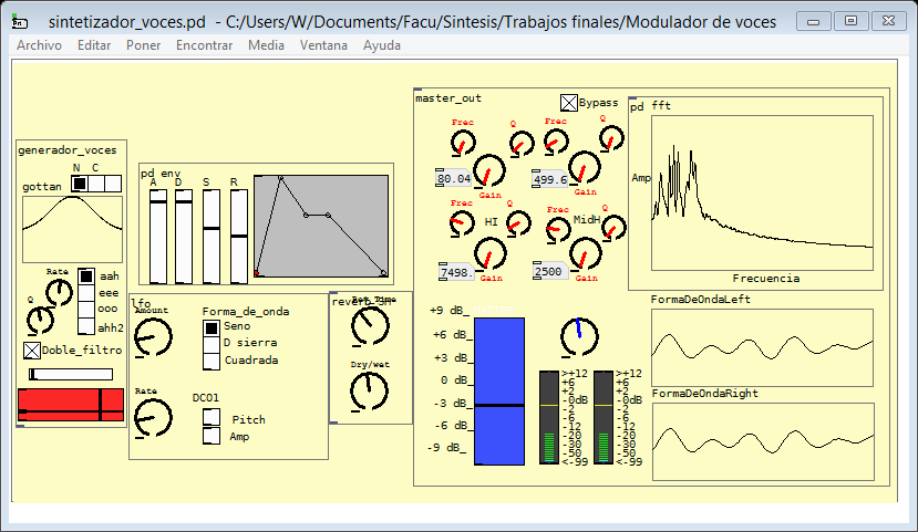 This is a voice modulator implemented in PureData. Differents techniques are applied in order to find the best result for choir (Vocal tract, subtractive synthesis, AM, FM, etc) Also included some effects like Vibrato, Tremolo and Reverb. The folder also has a description of the project with block diagrams and an user manual. The modulator can also be used with a midi controller.