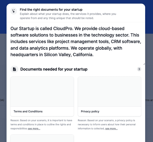 Give a basic brief about the startup, what it does and some more, and Airstrip AI will provide you with the documents that fit your startup's specific scenario. Provide information about your business and some details specific to the document, to prepare a customized flow for ease and accuracy. Suggestions give you an idea of how to answer the question and also provide potential answers based on the context you provided. You can ask legal questions about your startup, and get customized answers based on where you operate, and the type of business. See how Airstrip makes the process of handling the legal side of your startup and creating legal documents personalized, easier and more efficient.