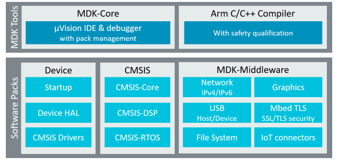 Keil® MDK is the most comprehensive software development solution for Arm®-based microcontrollers and includes all components that you need to create, build, and debug embedded applications. MDK-Core is based on µVision (Windows only) with leading support for Cortex-M devices including the new Armv8-M architecture. MDK includes Arm C/C++ Compiler with assembler, linker, and highly optimized run-time libraries that are tailored for optimum code size and performance. Software Packs may be added any time to MDK-Core making new device support and middleware updates independent from the toolchain. They contain device support, CMSIS libraries, middleware, board support, code templates, and example projects. The IPv4/IPv6 networking communication stack is extended with Mbed™ TLS to enable secure connections via the Internet. Product evaluation, small projects, and education. Code size restricted to 32 Kbyte.